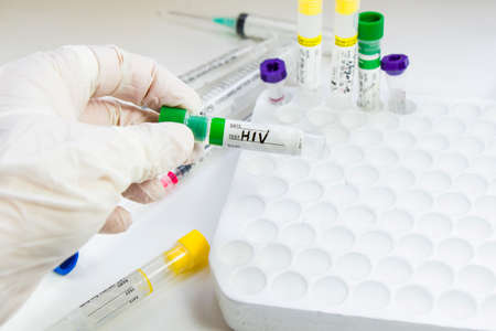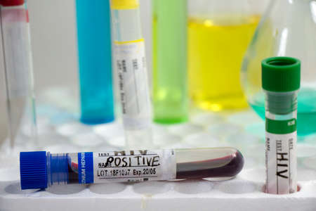 Hiv and aids infection blood test sample, diagnoses and laboratory chemical liquid elements, studio shoot on the white background