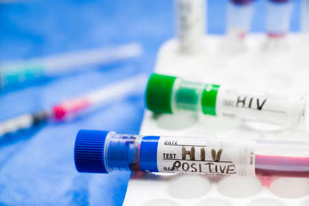 HIV and aids infection test, tube with blood on the blue background. Studio shoot.