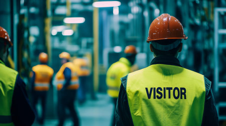 Visitors must wear safety gear like hard hats and fluorescent vests during industrial tours, highlighting the importance of workplace safety practices and inspections in active factory settings