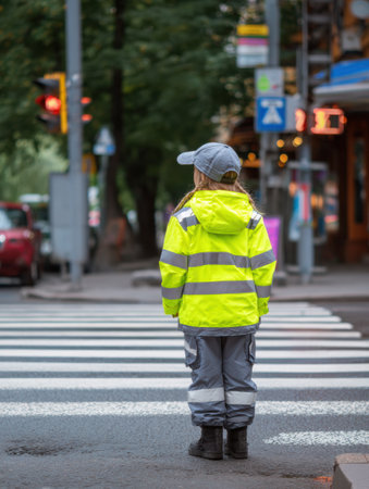 A child stands at a crosswalk wearing a yellow safety jacket and a cap, looking around while waiting for traffic to clear on a busy street.