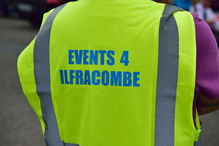 The image features a group of people wearing bright yellow and blue high-visibility jackets. The jackets appear reflective and the focus is on the upper bodies. The composition shows close-up details. The lighting suggests an outdoor or industrial setting. This image could be suitable for various commercial or editorial applications.