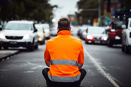 Protest activists wearing hi vis yellow orange jacket sit on a road and block traffic, crowd of protesters people fighting for their rights, A political activist protesting