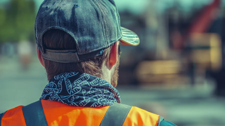 A construction supervisor in reflective gear stands overlooking a busy worksite with heavy machinery in operation, indicating progress and management