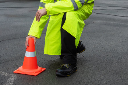 A worker wearing a bright yellow high-visibility raincoat and safety boots places an orange traffic cone on a wet asphalt road.