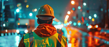 A construction worker wearing a hard hat and reflective vest stands at a construction site at night.