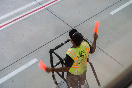 September 9, 2017 San Jose/CA/USA - Airport security employee guiding an airplane for docking