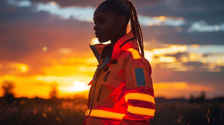 A person stands in reflective gear against a vibrant sunset, surrounded by open fields at dusk