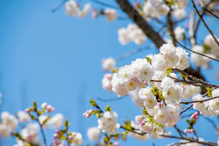 Beautiful colorful fresh spring flowers with clear blue sky. Cherry blossom bright pastel white and pink colors, summer and spring background full bloom close up