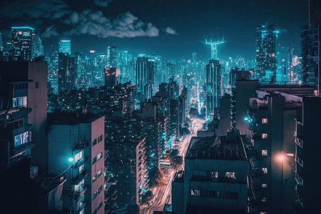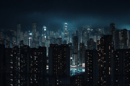Dense skyline of highrise buildings under vibrant city lights Dec 17 2025
