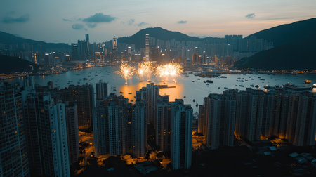 This breathtaking aerial photo captures the vibrant skyline of Hong Kong illuminated by an enchanting fireworks display over the Victoria Harbour at dusk.