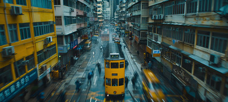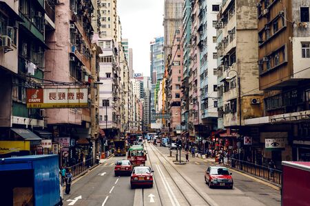 HONG KONG, CHINA - MAY 22, 2014: City trams with double deckers and city buildings on may 22, 2014 in Hong Kong