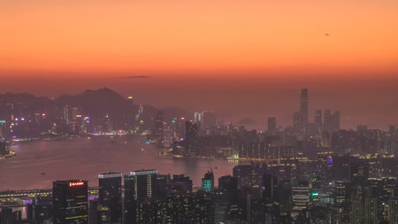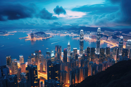 Hong Kong skyline at night. Hong Kong is the largest city in the world, Hong Kong city view from The Peak at twilight, AI Generated