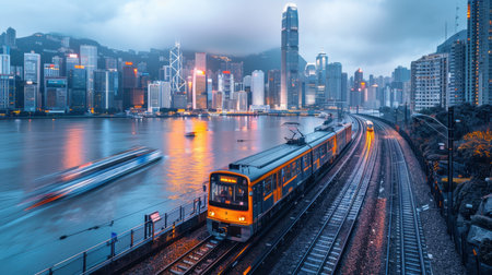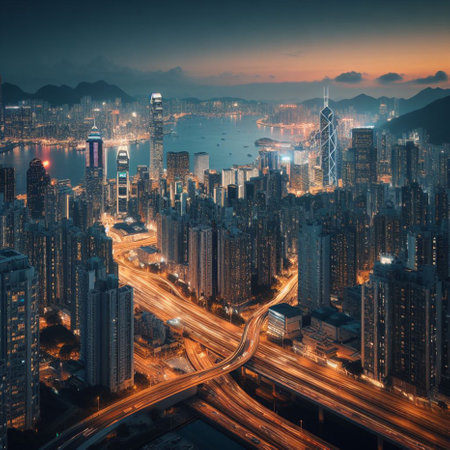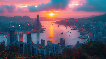 Hong kongs stunning skyline features modern skyscrapers glowing at dusk, framed by majestic mountains, reflecting the vibrant energy of the dynamic metropolis