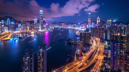 Colorful city night scene with modern skyscrapers and cars motion blurred in Hong Kong, Asia.