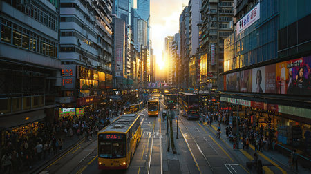 Golden hour illuminates skyscrapers and busy streets in vibrant city skyline