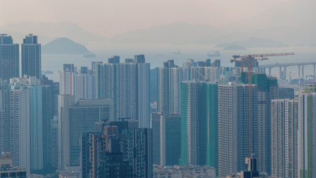 Aerial view of foggy cityscape in Hong Kong at sunset