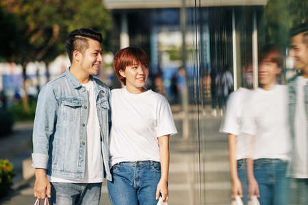 Young Asian couple walking along street with shopping bags looking at their reflection in glass window of mall building