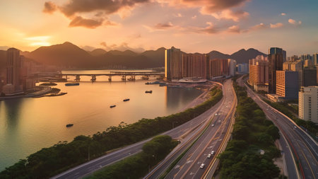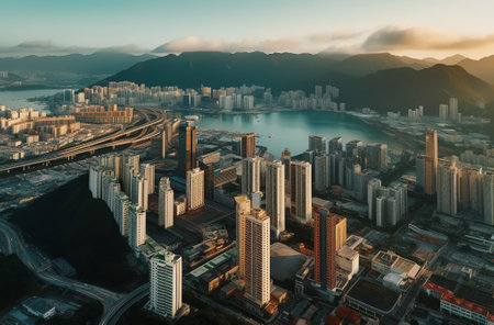 Generative AI : Aerial view of Hong Kong skyline along the waterfront at sunset Kowloon district Hong Kong China