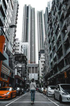 Attractive girl walking among supertall residential buildings and expensive cars in Hong Kong China
