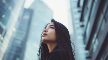 Young Professional Woman Looking Upward in Urban Setting