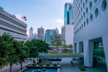 Hong Kong, China - 2020: Jardine House - a building with round windows, Connaught Place with original modern street sculpture and fountains, Hong Kong General Post Office building.