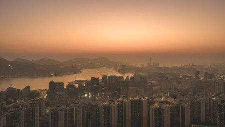 Hong Kong, China - October 6, 2018: Hong Kong skyline at sunset from Victoria Peak. Dense haze over the evening city