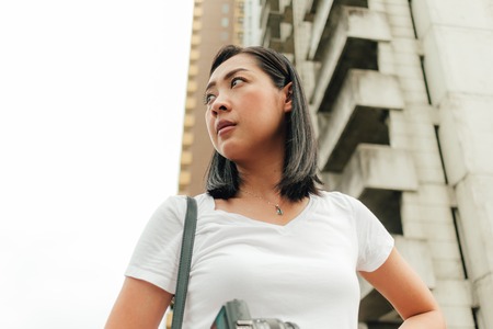 Urban dweller amidst towering residential buildings in a modern cityscape