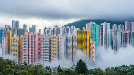 A mesmerizing view of colorful high-rise buildings enveloped in fog, showcasing an urban landscape where modern architecture meets natural beauty. Perfect for travel and city-themed projects.