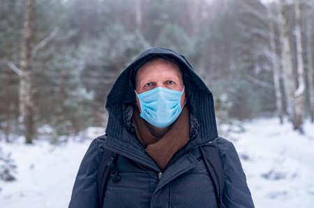 Portrait of a woman wearing a medical protective mask on her face in winter, Covid-19 coronavirus pandemic, virus protection.