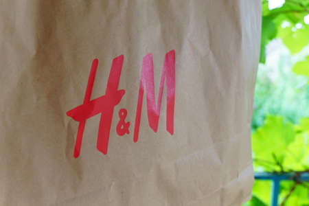 Volzhsky, Russia-September 26, 2021: h and m logo on a paper bag close-up. Selective focus