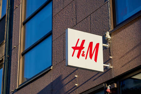 TURKU, FINLAND - 26 FEBRUARY 2021: H and M logo on the front of the building. Clothing-retail company.