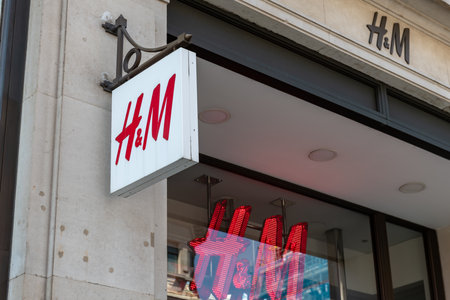 London. UK- 04.09.2023. The name sign of the H and M retail store in Oxford Street. A Swedish multinational clothing company brand.