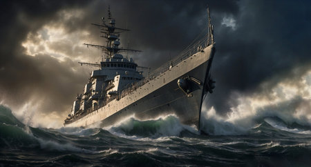 A powerful military ship sailing majestically across the ocean, with waves crashing against its hull, representing strength and resilience at sea