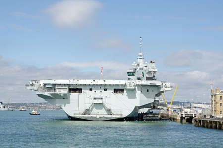 Stern of the massive Queen Elizabeth Aircraft Carrier docked at Portsmouth Harbour, Hampshire. The Royal Navy ship is the largest in the fleet.