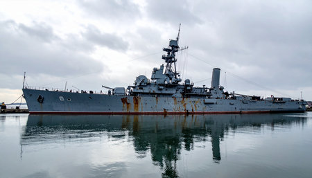 A veteran warship rests silently in the calm harbor waters, its powerful form reflected under a dramatic, overcast sky. Once a symbol of naval might, it now stands as a historic monument, a quiet testament to a bygone era of conflict and courage.