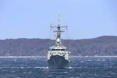 Jervis Bay, Australia - October 1, 2013: HMAS Sydney (FFG 03) Adelaide-class guided-missile frigate of the Royal Australian Navy.