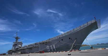 Large military ship moored to a pier in Kiel, Germany. Nautical vessel, transportation, special equipment, industry, international security and global communications concepts