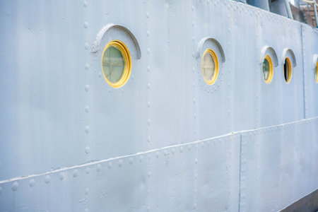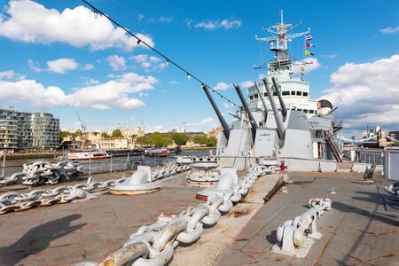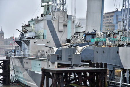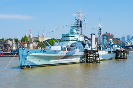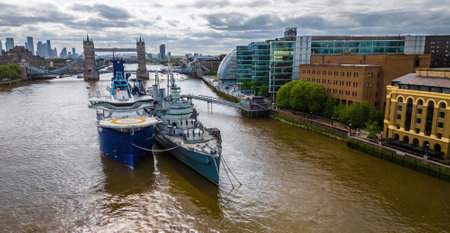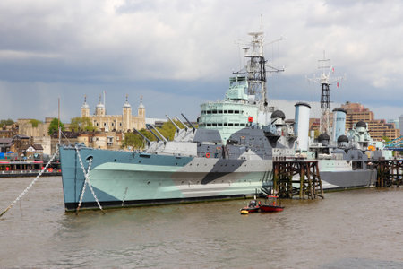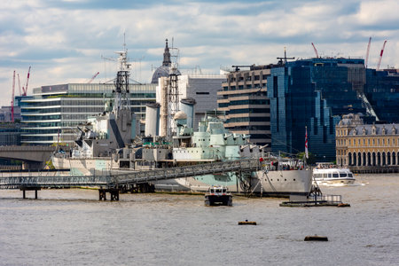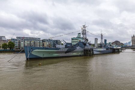 London, England - Apr 20, 2019 : HMS Belfast is a Town-class light cruiser that was built for the Royal Navy. She is now permanently moored as a museum ship in front of Tower Bridge on the River Thames, No focus, specifically.