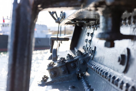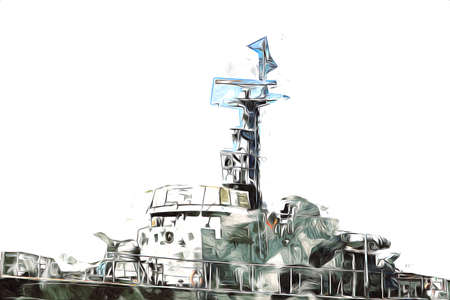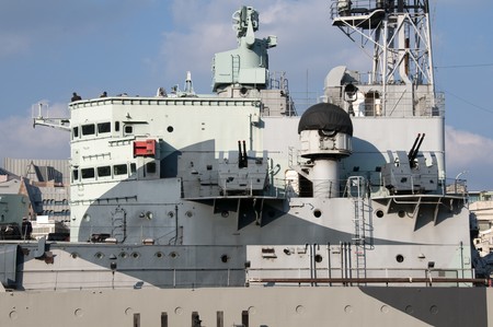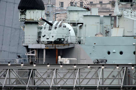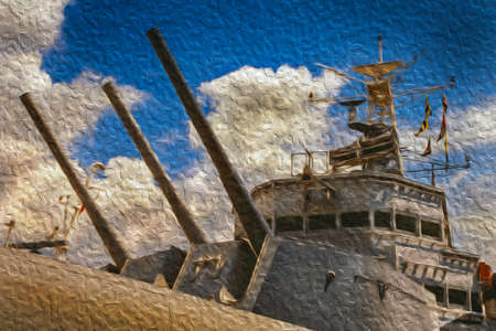 Heavy cannons and ship bridge on the HMS Belfast warship in London. Capital of England and the United Kingdom, is also one of the most important cities of the world. Oil paint filter.