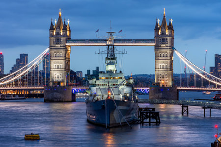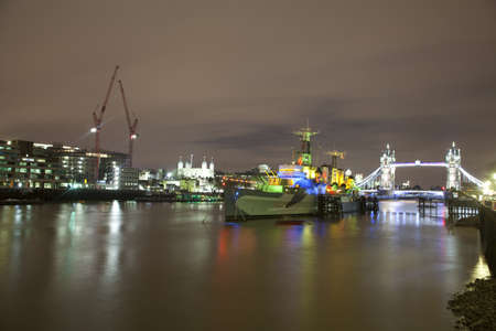Tower Bridge and Belfast warship on Thames river at night, London, UK