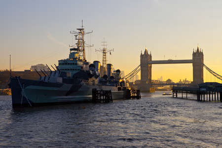 HMS Belfast sits on the River Thames in London during the morning. The iconic Tower Bridge stands in the background as the sun rises, illuminating the city.