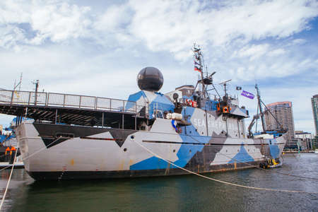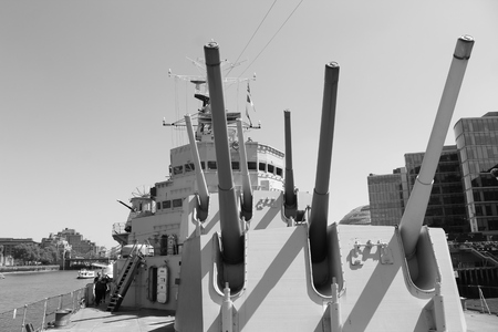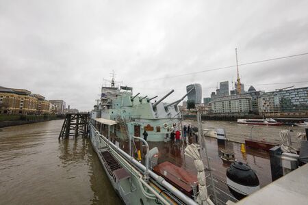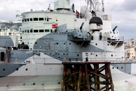 LONDON, UK - APRIL15, 2015: Old battle ship. South bank of river Thames walk.