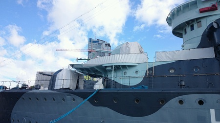 View of HMS Belfast Royal Navy light cruise warship Museum in London.
