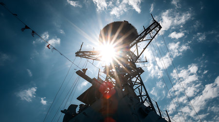 Low-angle shot showcases a silhouetted ship mast and radar against a bright blue sky dotted with fluffy clouds, with the sun creating a radiant burst.