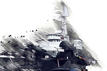 Military ship goes through the rough atlantic sea illustration vintage retro art drawing