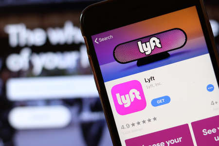 Phone with Lyft icon on screen close up with blur website on laptop. Los Angeles, California, USA - 30 November 2019, Illustrative Editorial.