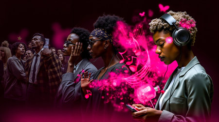 This illustration blends vintage aesthetics with modern digital art techniques, evoking a sense of futuristic nostalgia. Its vibrant and dynamic composition makes it ideal for music-themed projects, tech industry promotions, or creative design portfolios. The abstract geometric backdrop enhances the visual impact, appealing to audiences interested in retro-futurism and innovative art. AI-generated illustration.