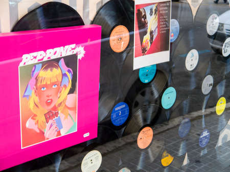 San Francisco, California, USA, August 2019: Music store with retro styled image of boxes with vinyl turntable records, San Francisco, USA