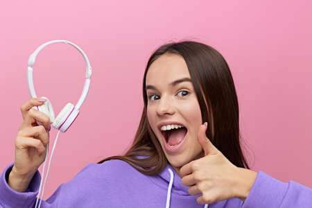 a close portrait of a happy, emotional woman in purple clothes with headphones in one hand and smiling broadly looking at the camera showing a thumbs up with the other hand