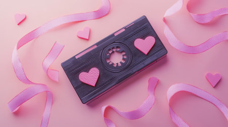 Cassette tape with its tape unraveled and shaped into multiple hearts, lying on a soft pink surface, perfect for a love song theme.